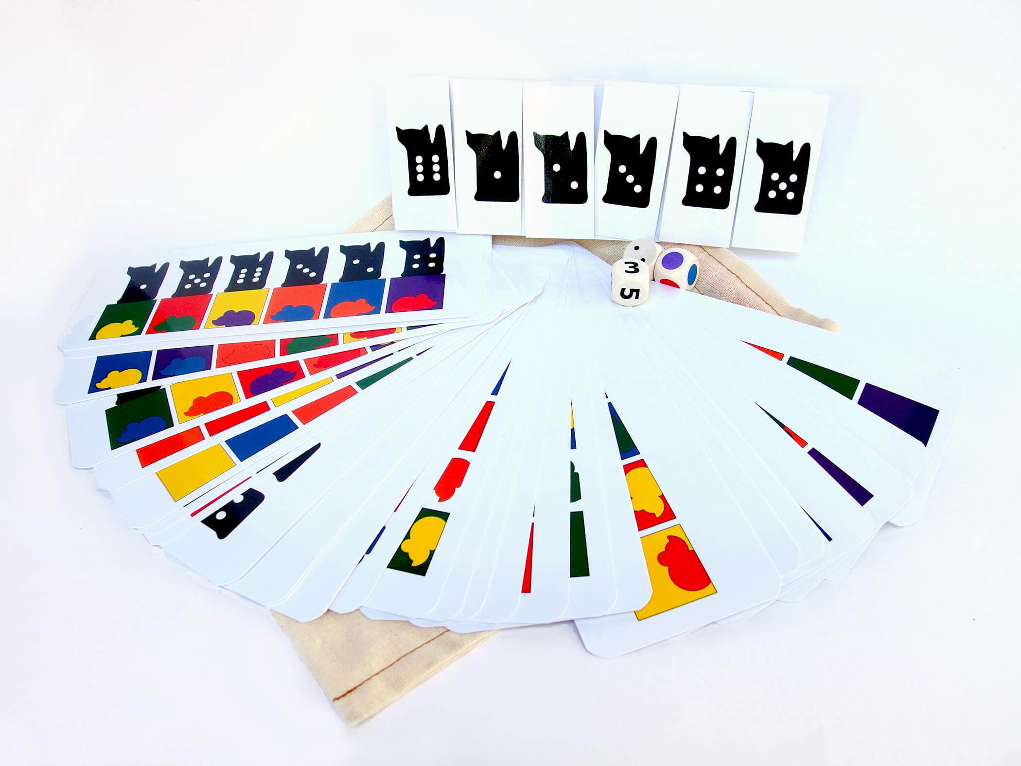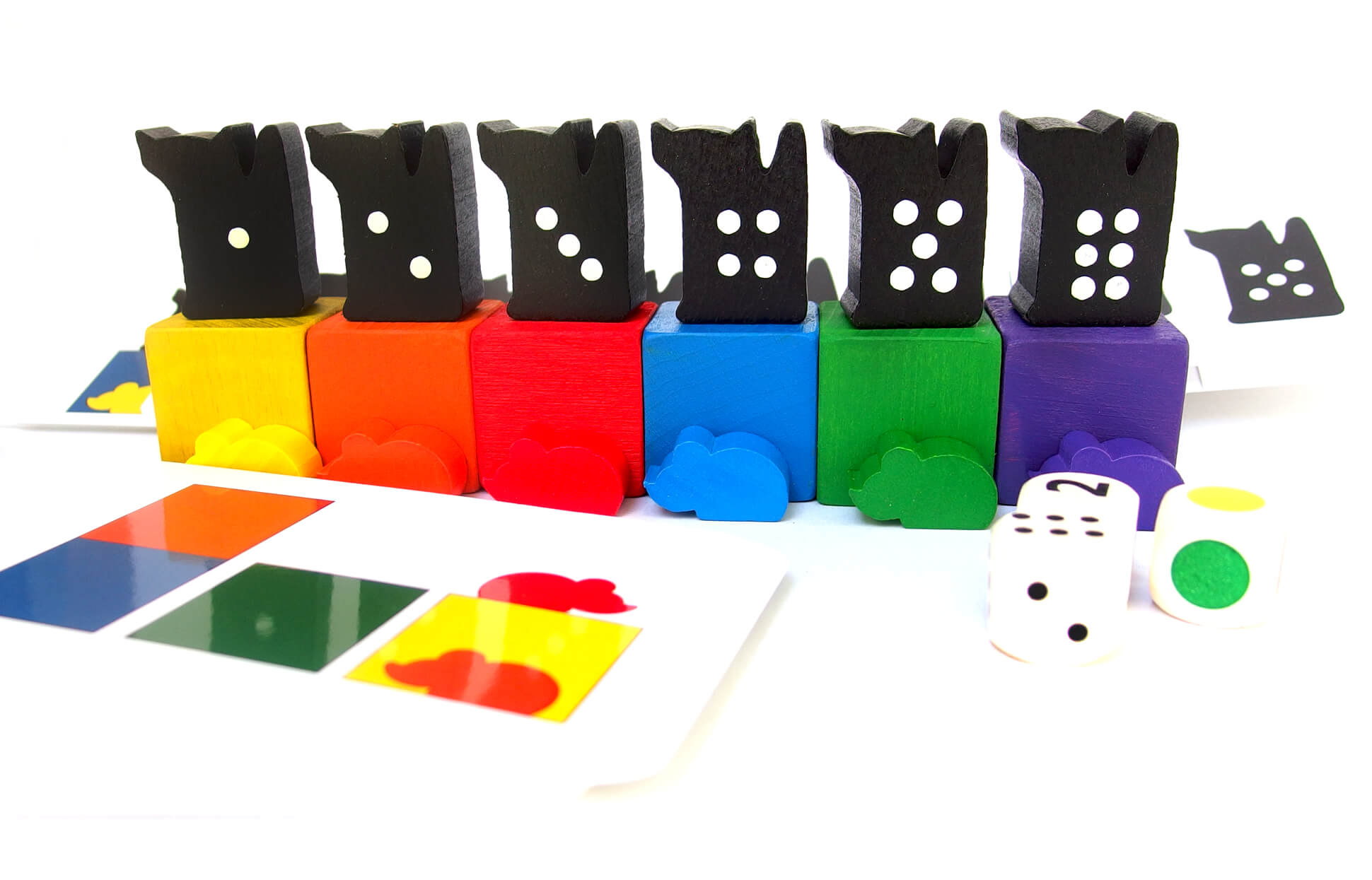 - 28 kart pracy ze schematami do odwzorowywania z grubego kartonu- profesjonalnie wydrukowanego w drukarni. Karty są uszeregowane poziomem trudności: od samego układania klocków w odpowiedniej kolejności, do schematu z kotami, klockami i myszkami